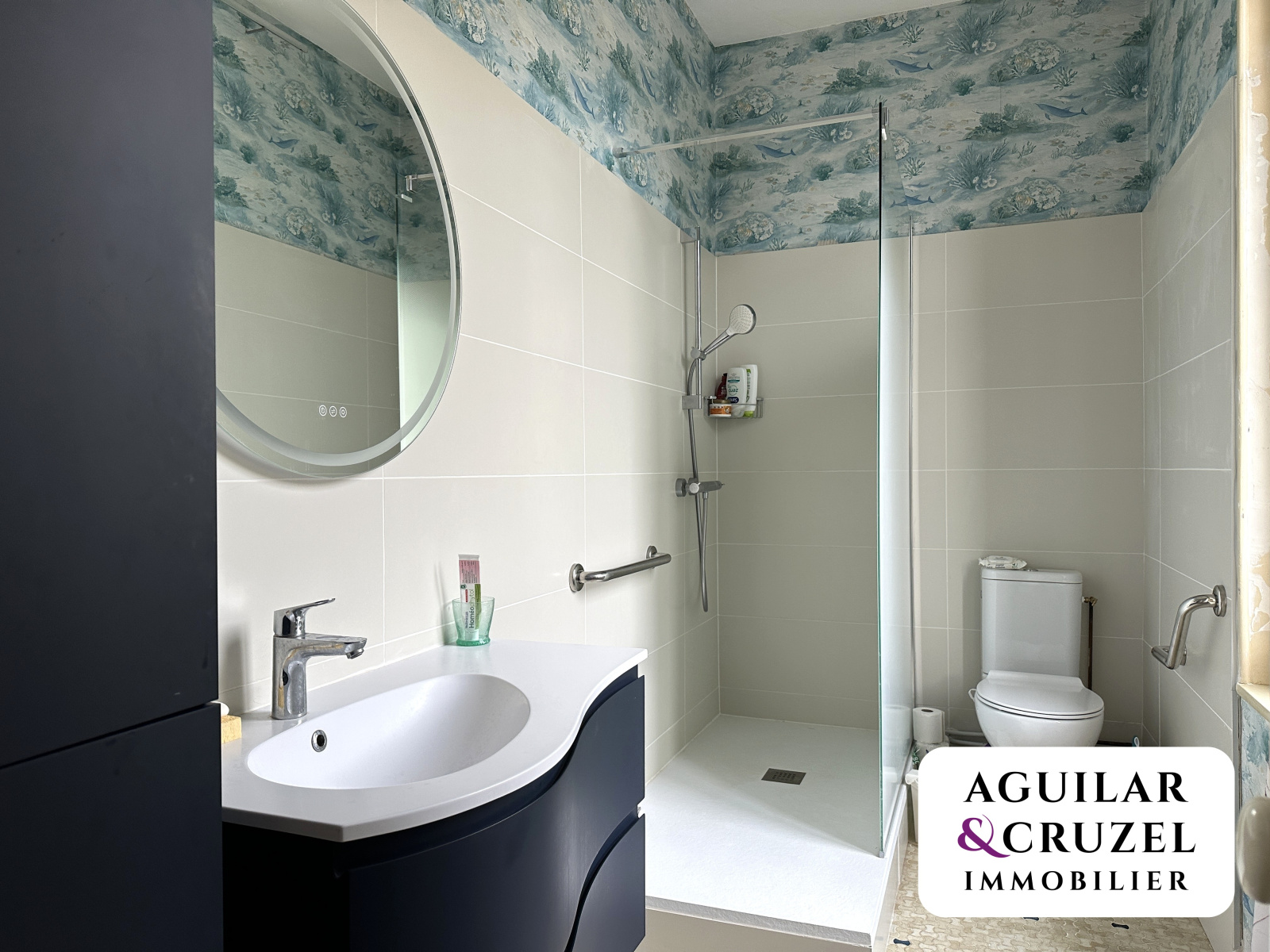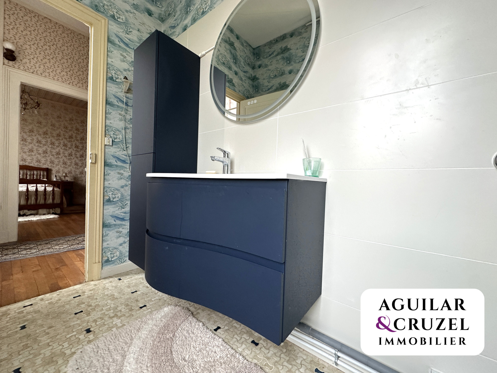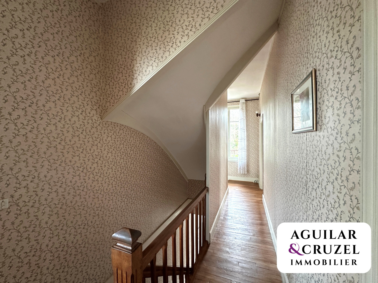 Un bel escalier en bois mène au premier étage, où vous trouverez un vaste palier desservant trois chambres, dont une avec point d’eau, ainsi qu’une salle d’eau moderne avec WC.