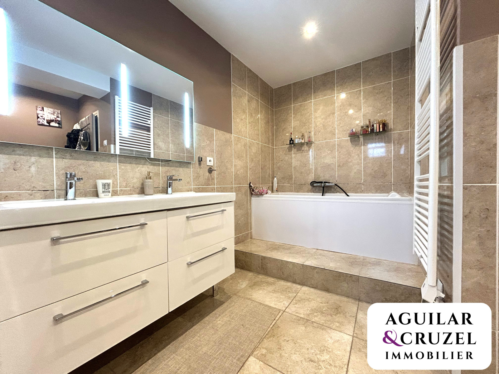 Vous y trouverez également une grande salle de bain, équipée à la fois d’une douche et d’une baignoire, ainsi qu’une buanderie pratique au quotidien.