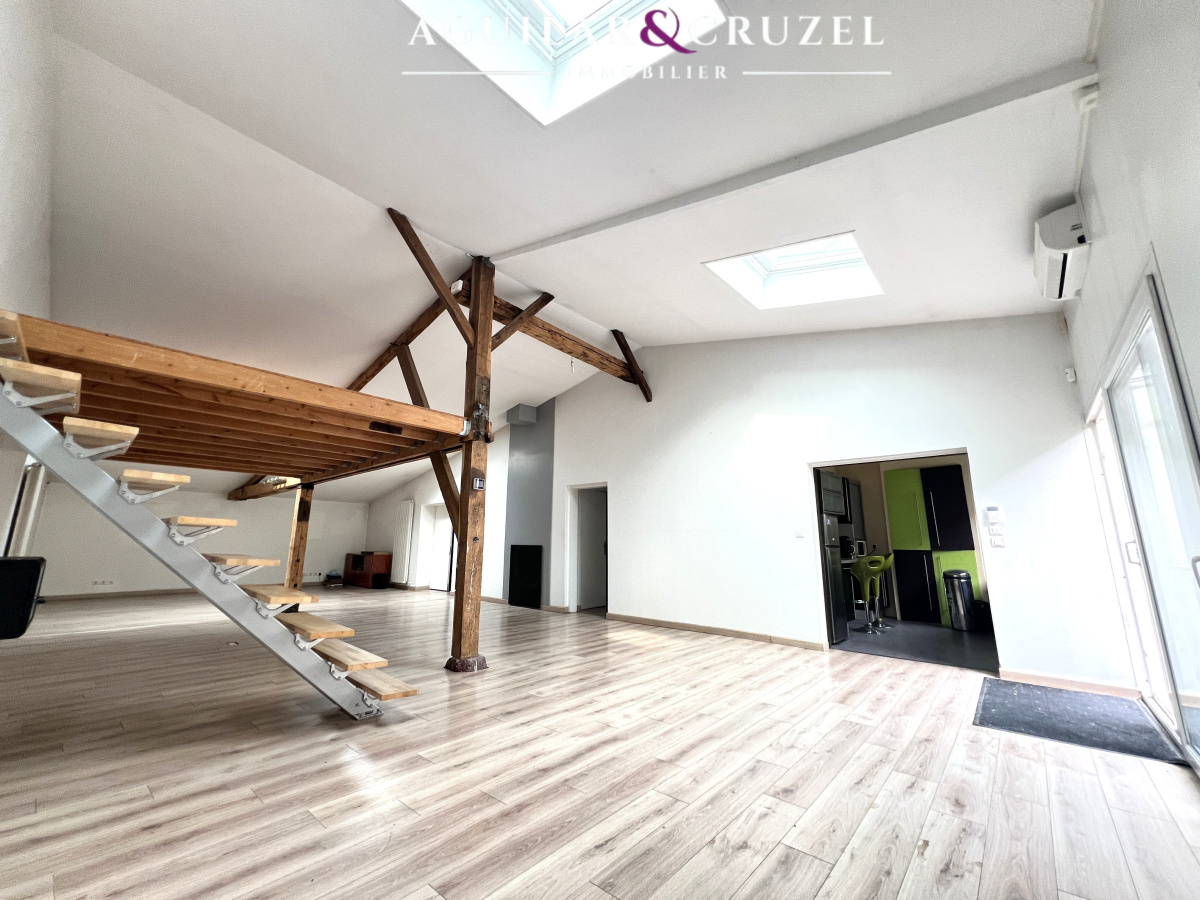 Cette maison de style loft offre un vaste séjour lumineux d’environ 80 m², deux chambres confortables, une cuisine aménagée et équipée, une salle d’eau ainsi que des WC séparés.