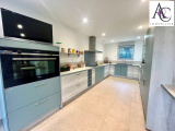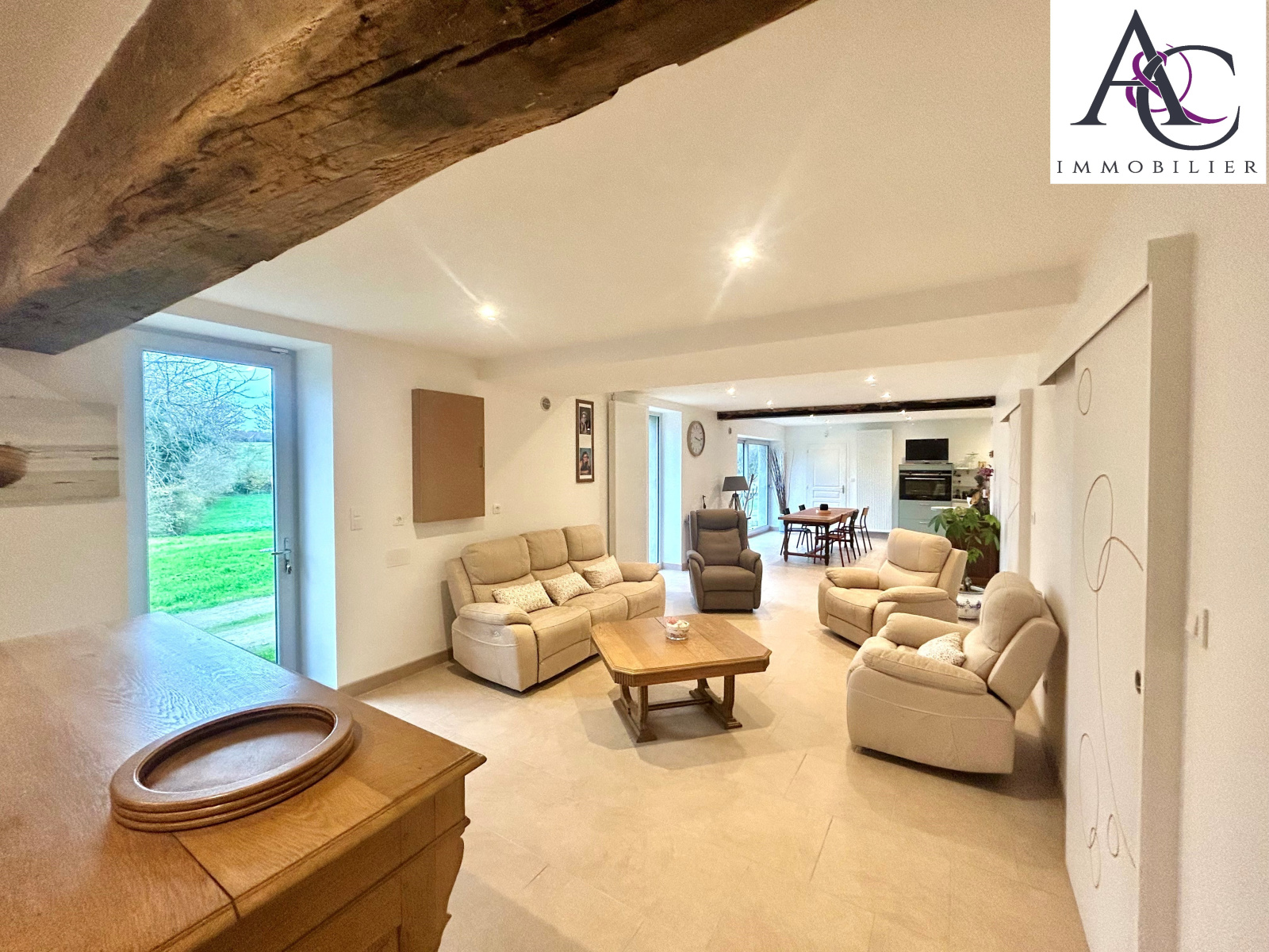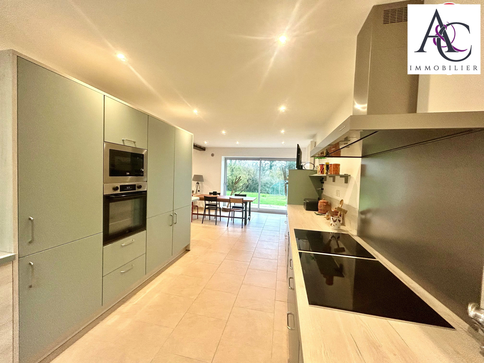 Une vaste pièce à vivre intégrant une cuisine aménagée et équipée, un salon et salle à manger baignés de lumière grâce à une grande baie vitrée avec vue sur le parc.